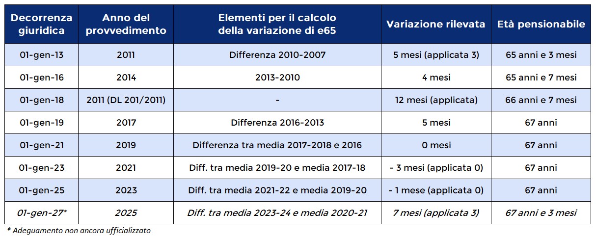 • 2027 (previsione): possibile aumento di 3 mesi, con età pensionabile a 67 anni e 3 mesi.